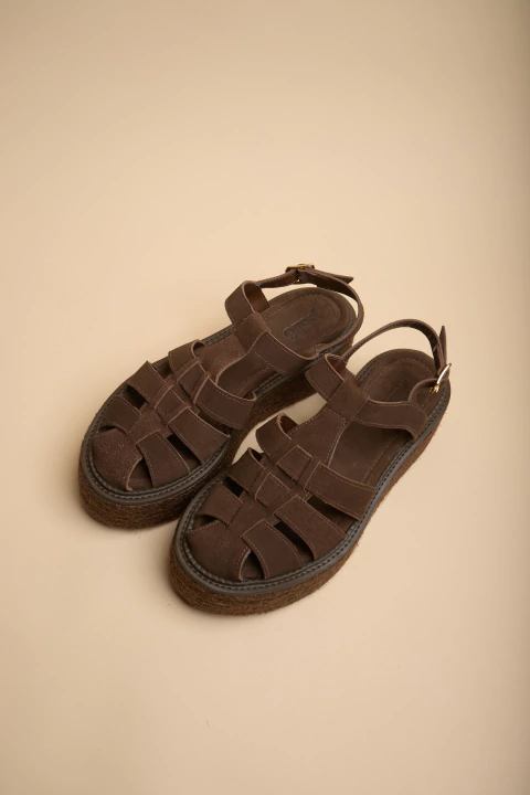 Inspirada na clássica sandália fisherman, ela surge em uma releitura contemporânea em couro camurça macio, com tiras estruturadas que abraçam o pé com conforto e segurança.