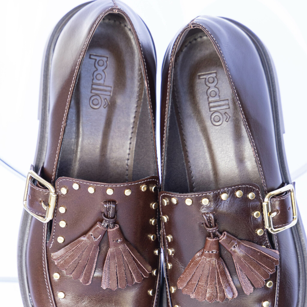 Produzido em couro legítimo, esse mocassim se destaca pelos detalhes marcantes: mini studs dourados que contornam o cabedal com leve brilho e os charmosos tassels artesanais, que trazem movimento e sofisticação à peça. A fivela lateral adiciona um toque utilitário moderno, enquanto a palmilha macia garante conforto absoluto.
