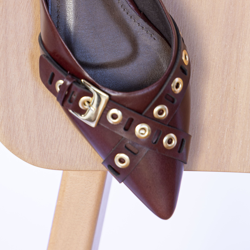 Com bico fino, amarração delicada no tornozelo e tirinhas adornadas com ilhoses metálicos dourados, ela transforma a flat clássica em um verdadeiro statement de estilo.